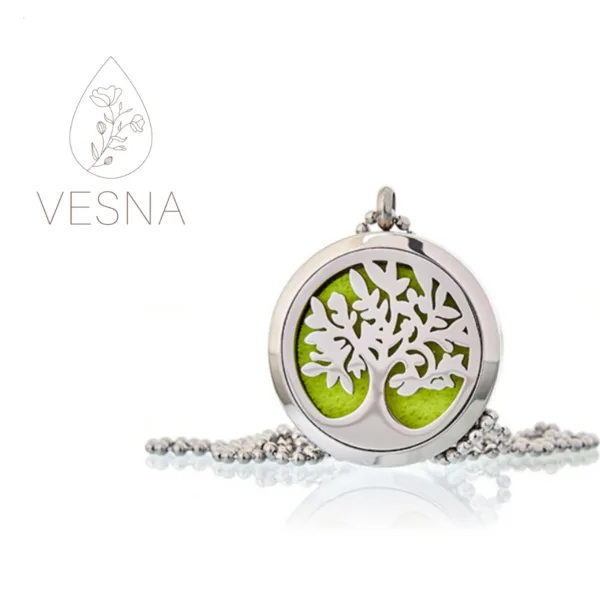 Naszyjnik o średnicy 30 mm zawieszony jest na 60 cm łańcuszku, z możliwością regulacji. Do biżuterii dołączony jest zestaw kolorowych wkładek filcowych do nasączania olejkami – można zmieniać aromaty w zależności od nastroju.