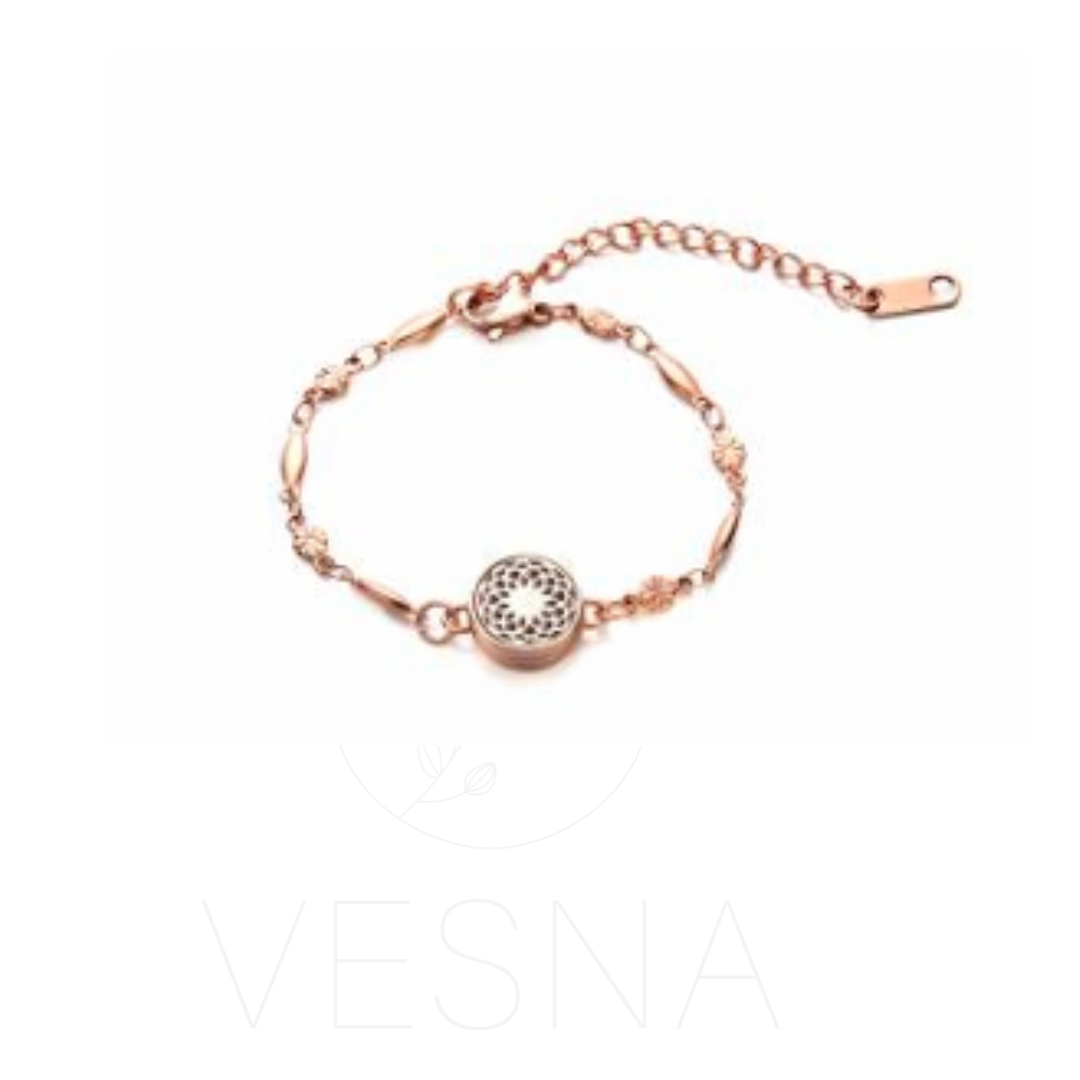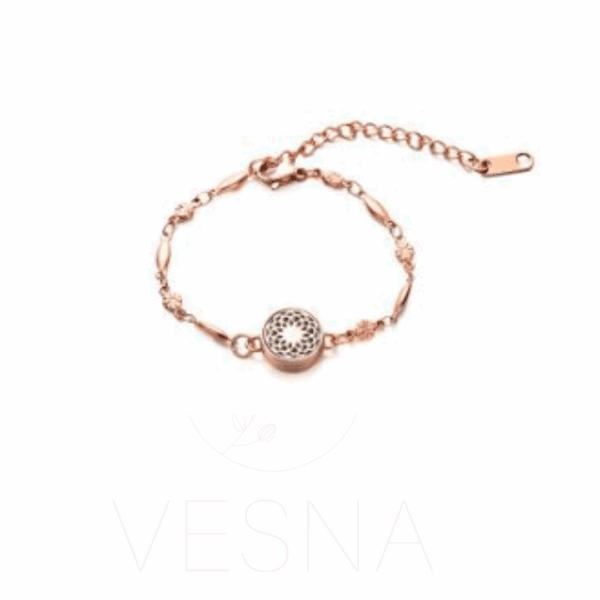 Prześliczna bransoletka do aromaterapii w kolorze różowego złota. Ozdobny łańcuszek i ażurowy medalion (12mm) do nakropienia olejku eterycznego z motywem harmonijnego Kwiatu Życia – symbolu harmonii.