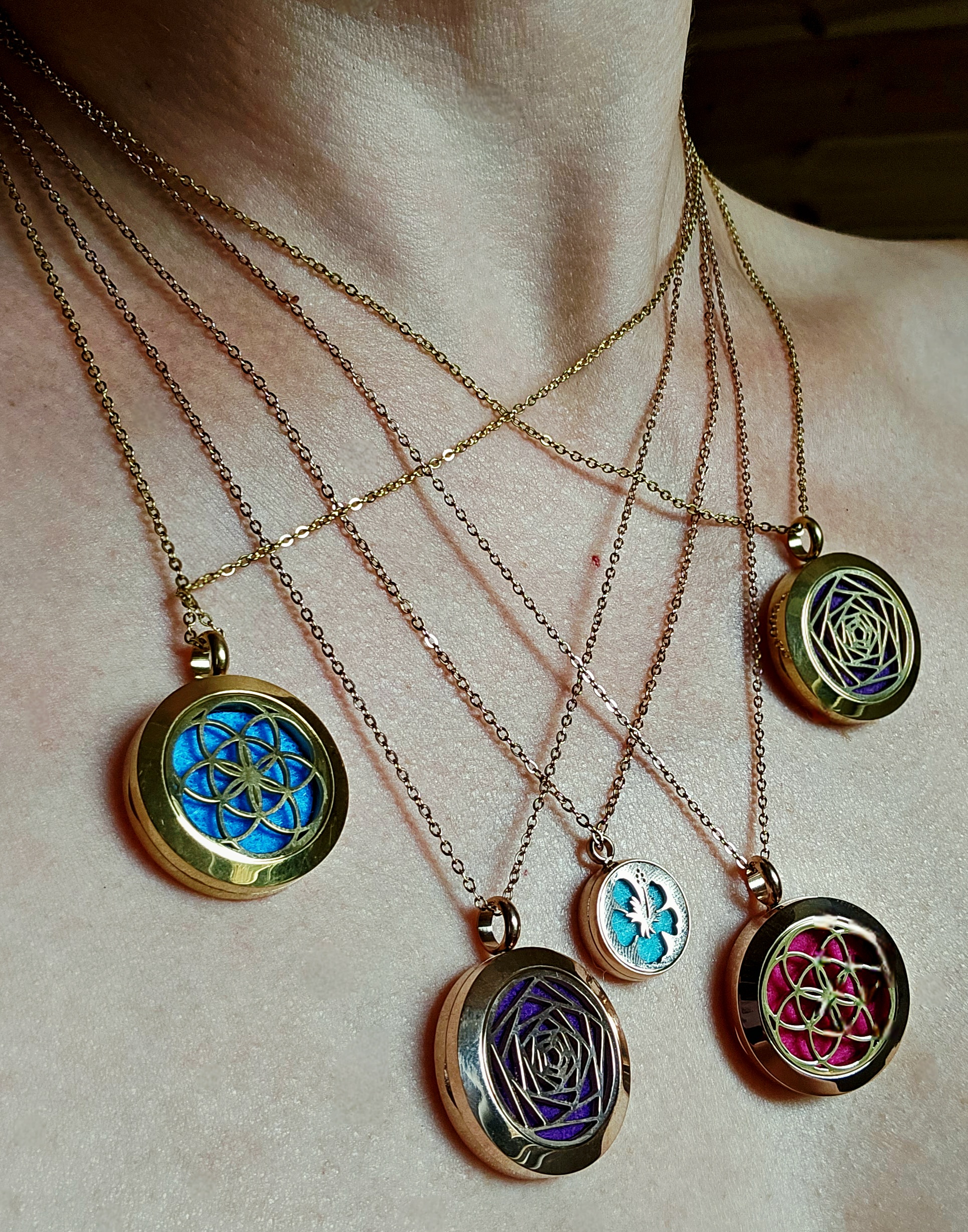 Wewnątrz zawieszki umieszcza się filcową wkładkę — wystarczy dodać kilka kropli ulubionego olejku eterycznego, aby otulić się zapachem dodającym energii lub pomagającym wyciszyć umysł. Aromaterapia, którą możesz mieć zawsze przy sobie — w pracy, podróży, na spacerze.